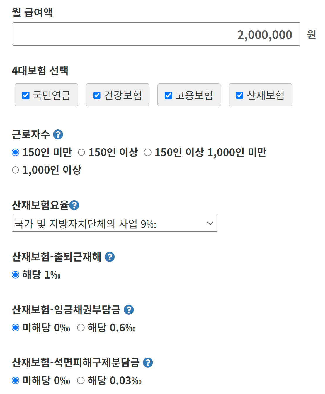 공단 4대보험 모의계산기는 산재보험 산출은 되지 않지만 엔젤시터 모의계산기는 산재보험도 산출이 된다.