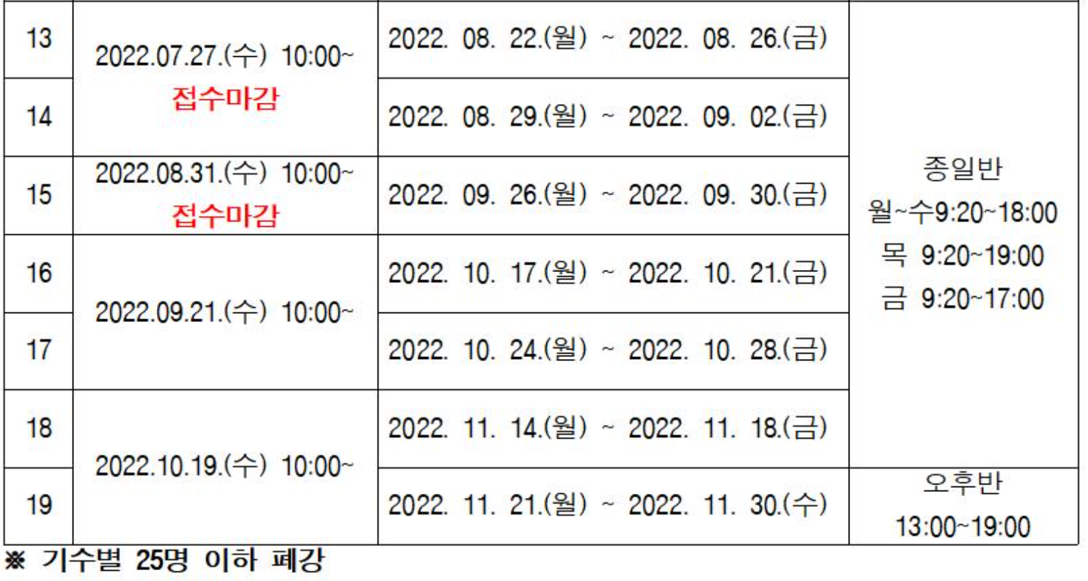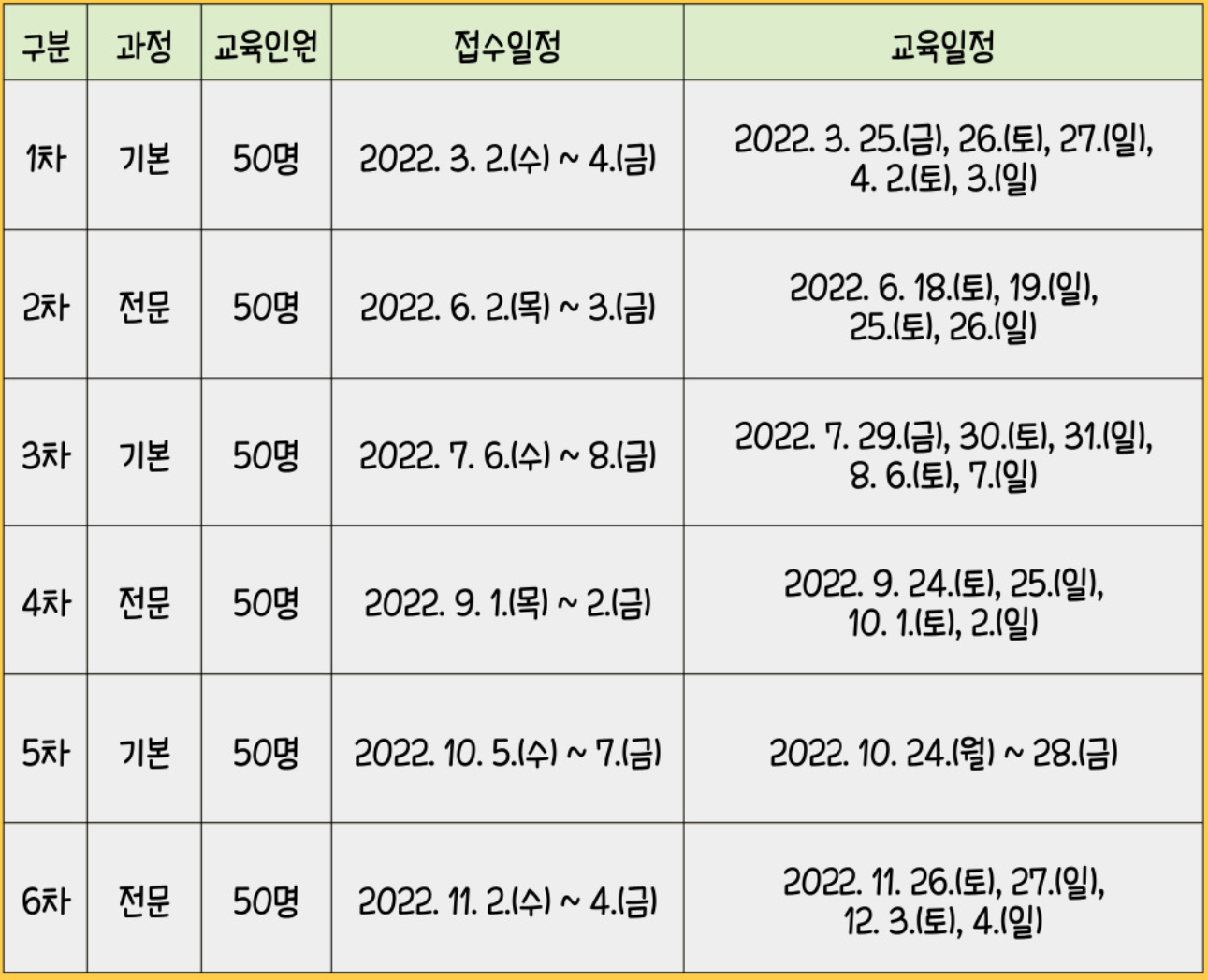 2022. 10. 15.(토) ~ 11. 12.(토)주말반(매주 토) | (수정) 2022. 9. 26.(월) 09:00~모집 마감시 까지 |