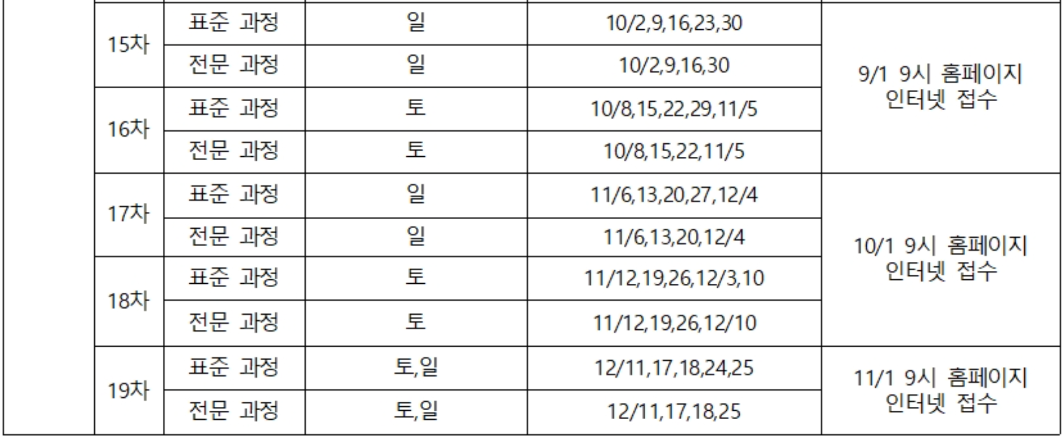 | 11월 | 10 | 표준 | 11/14(월)~11/18(금) | 10/25(화)~ 온라인 접수 |