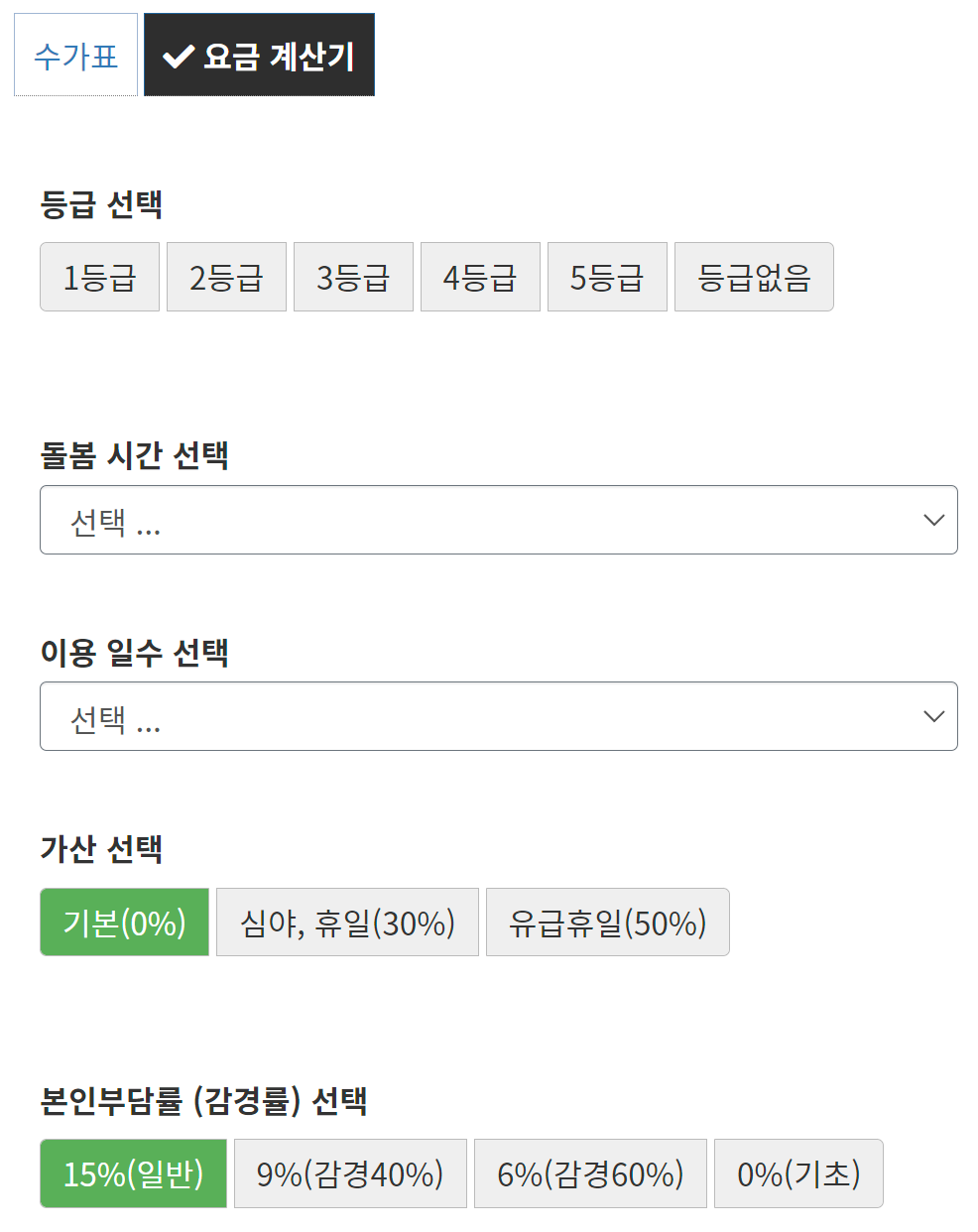 등급을 선택 후 돌봄 시간과 이용일수만 선택하면 자동으로 계산해 준다.