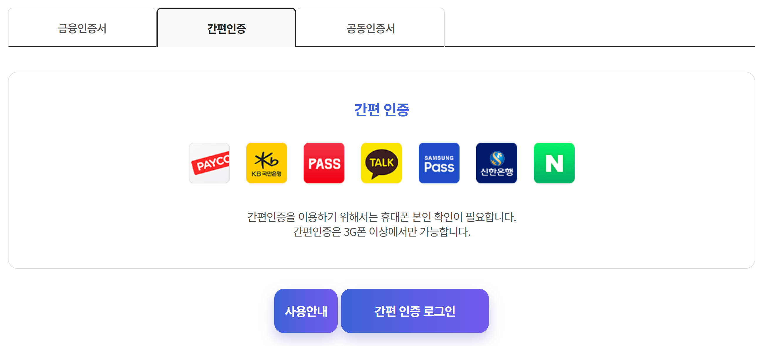 로그인은 금융인증서, 간편인증, 공동인증서로 가능하다.