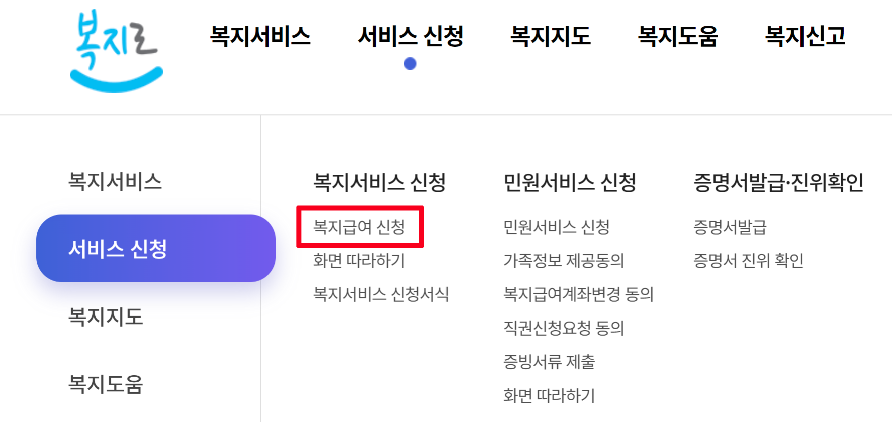 복지로 복지급여 신청 메뉴