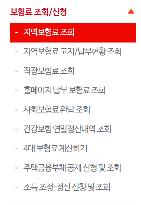 좌측 메뉴에 지역보험료 뿐 아니라 직장보험료 등 다양한 나의 보험료 관련 내용을 조회할 수 있다.
