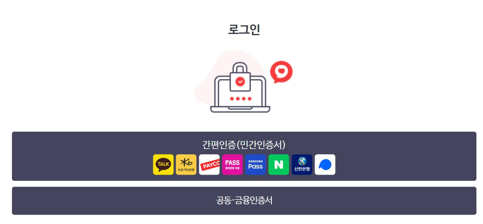로그인은 공동인증서 또는 공인증서로 가능하지만 다양한 민간 간편 인증서로 로그인도 가능하다.