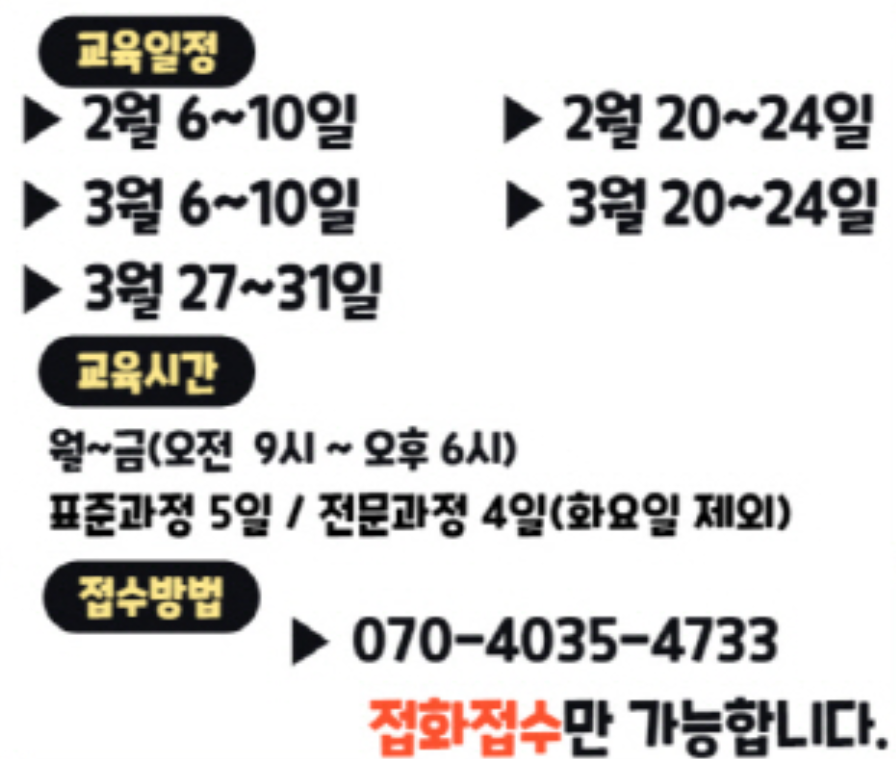| 신규 평일반 | 2차 | 40 | 2023년 2월 13(월)~ 2월 17(금) (5일간 오전 9시 ~ 오후 6시) |