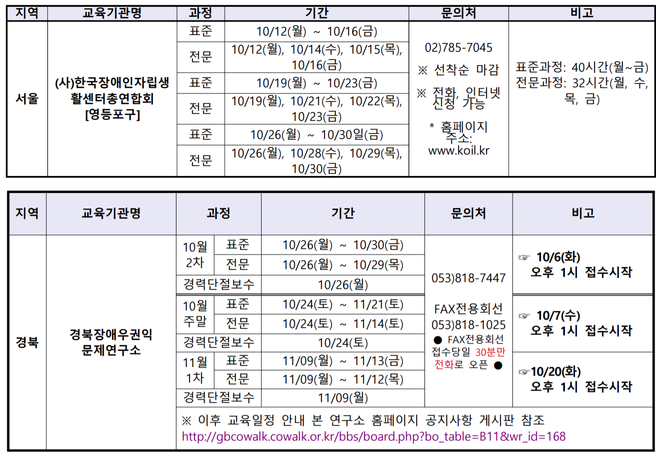 내 지역에서 가까운 장애인활동지원 교육 기관을 찾는 사이트를 이용해서 교육 일정을 문의해 보세요.