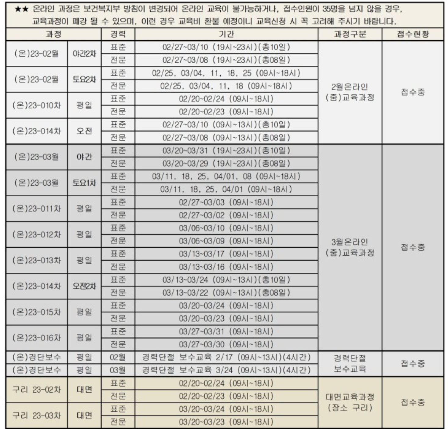 교육일정은 해당 교육기관 사정에 따라 변경될 수 있으니 자세한 일정 및 접수는 홈페이지 또는 해당 기관에 문의해 봐야 한다.