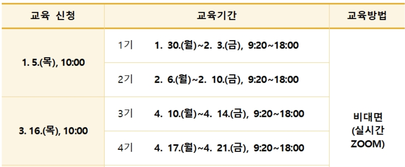 | 구분 | 과정 | 방법 | 인원 | 접수일정 | 교육일정 |