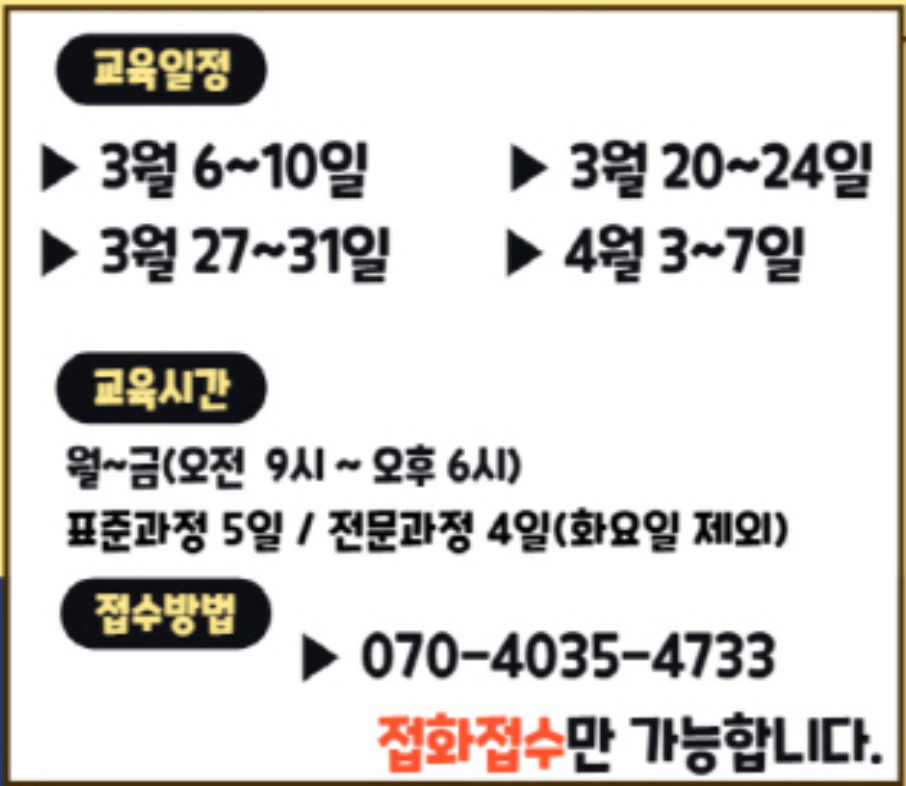 기본 : 월~금, 5일 수강(오전9시~오후6시), 교육비 15만원