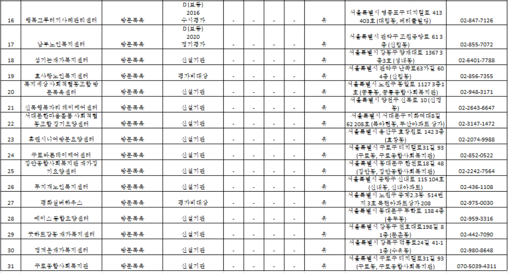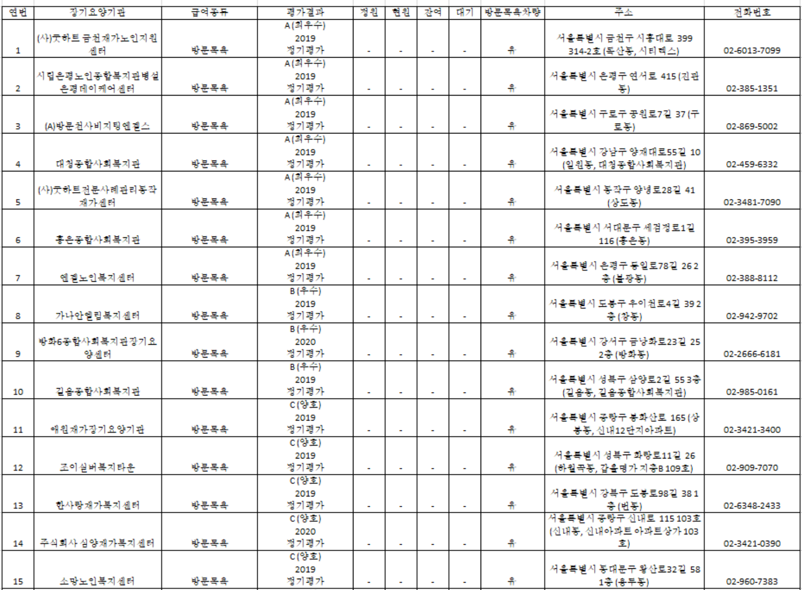 서울 지역 방문목욕 서비스를 제공하는 재가복지센터 중 차량을 지원하는 기관 목록이다.