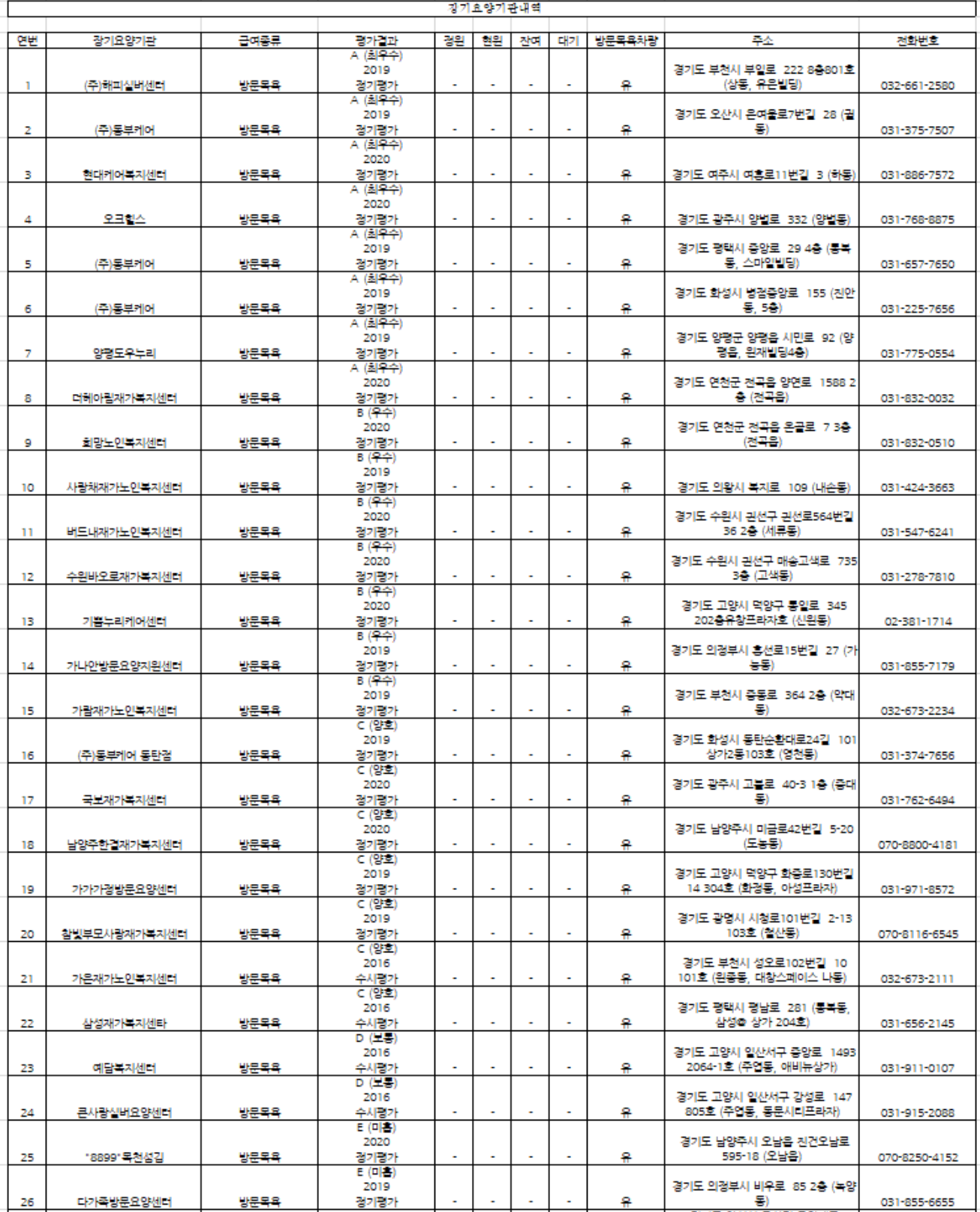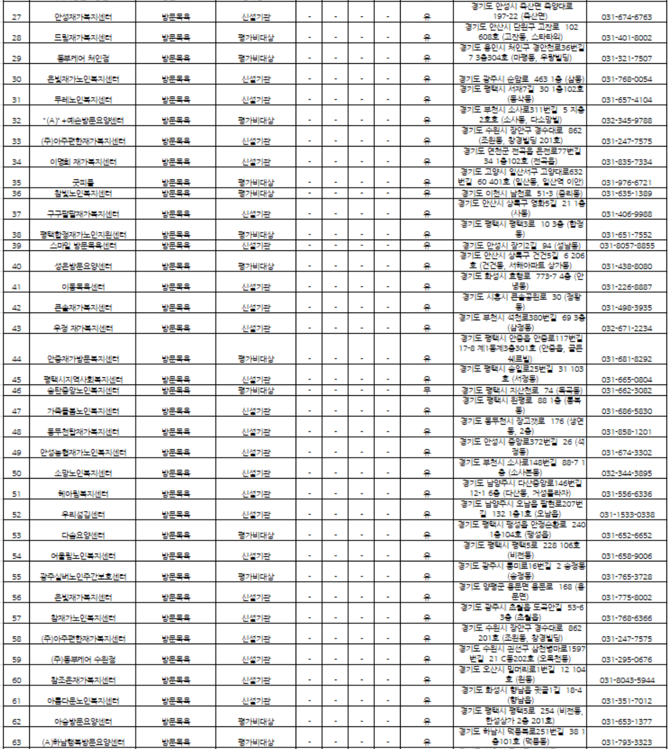 경기도 지역 차량을 지원하는 방문목욕 재가복지센터 기관 목록의 연락처와 주소이다. 첨부파일은 맨 하단에 있다.
