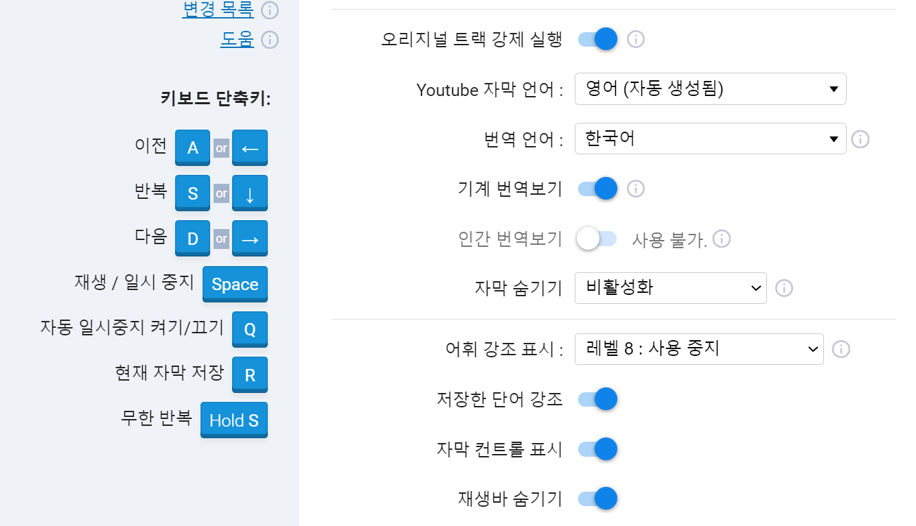 좌측 패널에는 영어 스크립트도 볼 수 있고 구간 반복은 영어 학습 기능이 있습니다.