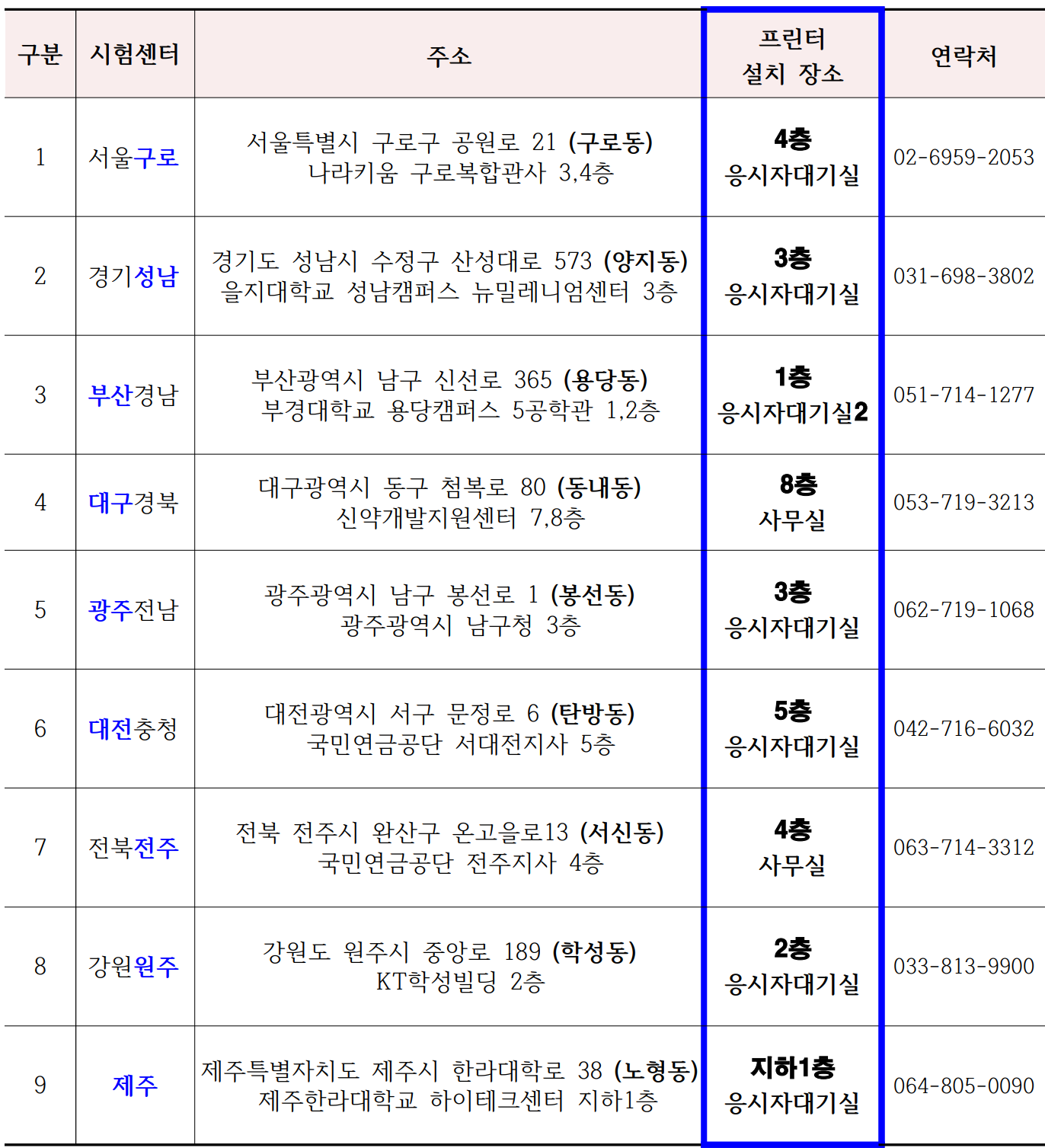 시험센터별 자격증 출력 전용 프린터 설치장소