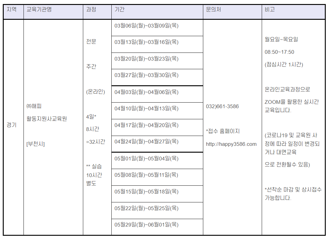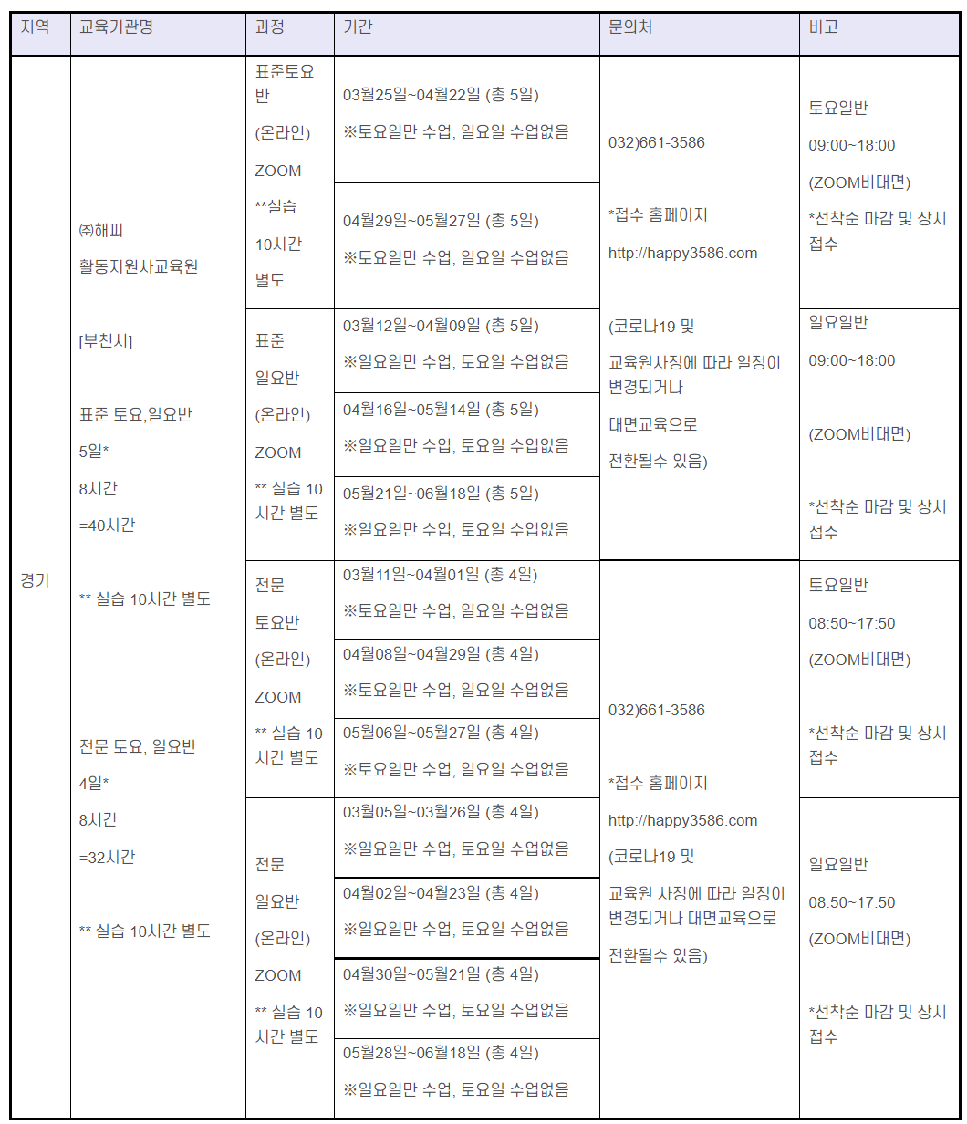 | 장애인활동지원사양성교육 | 2023년 5월(6차주말) | 전문과정:5월13일(토),20일(토),27일(토).6월3일(토)/ 표준과정: 5월13일(토),20일(토),27일(토).6월3일(토), 6월10일(토) 접수 : 4.5.(수)09:00~ 선착순으로 마감함 |