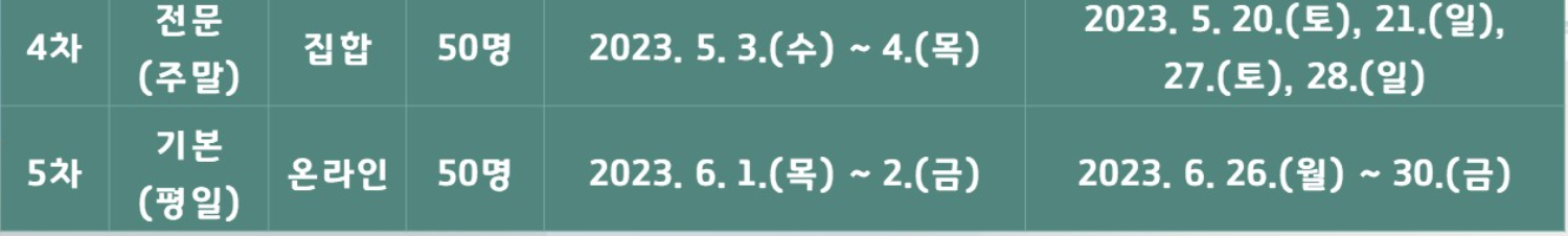 | 15회 | 2023년06월12일(월)~06월16일(금) 총 5일간 | 23년 06월 05일(월)~06월 09일 (금) 총 4일간 |