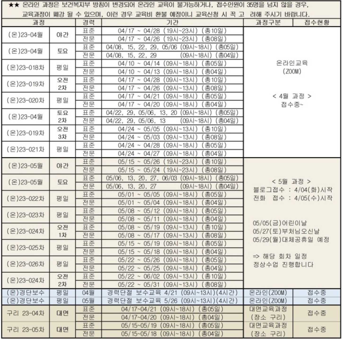 | 장애인활동지원사양성교육 | 2023년 5월(2차-B) | 표준과정:5월15일(월)~19일(금) / 전문과정:5월16일(화)~19일(금) 접수 : 4.3.(월)09:00~ 선착순으로 마감함 |