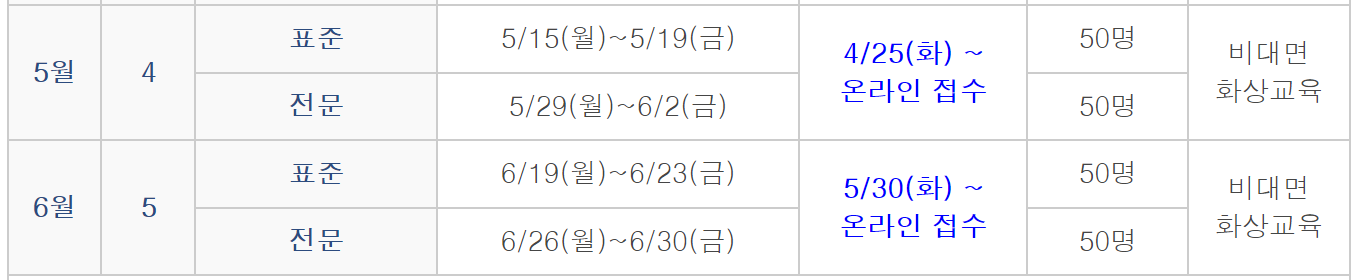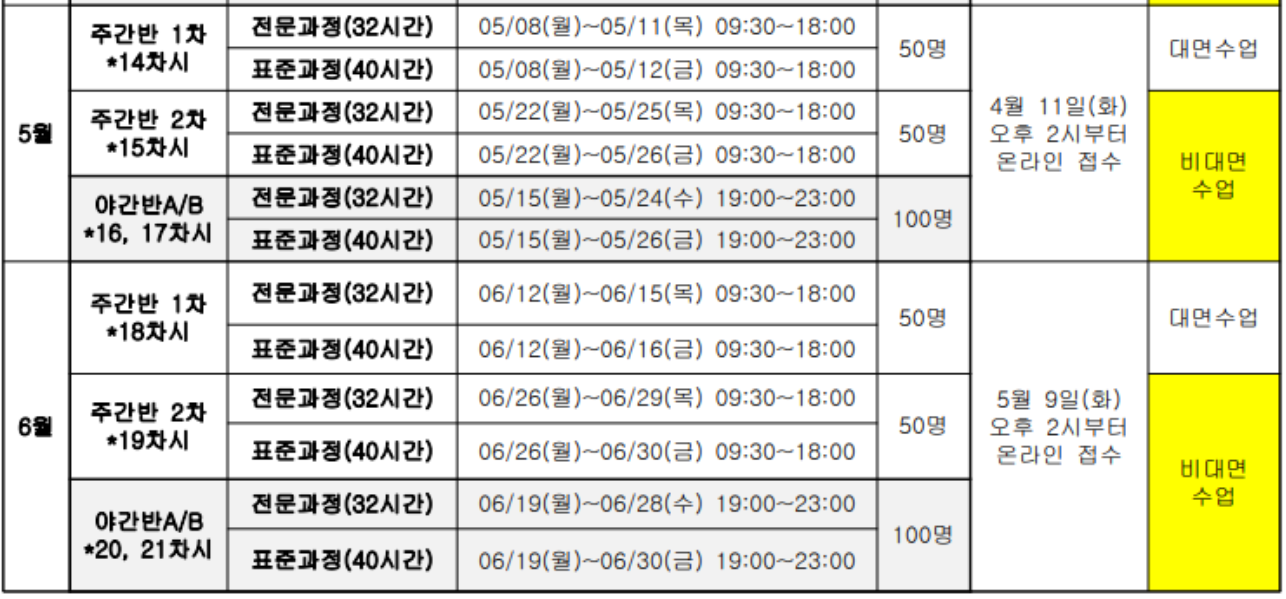 | 14회 | 토요반 6/3 6/10 6/17 6/24 7/1일반교육 총 5일간 | 토요반 6/3 6/10 6/17 6/24 유사교육 총 4일간 |