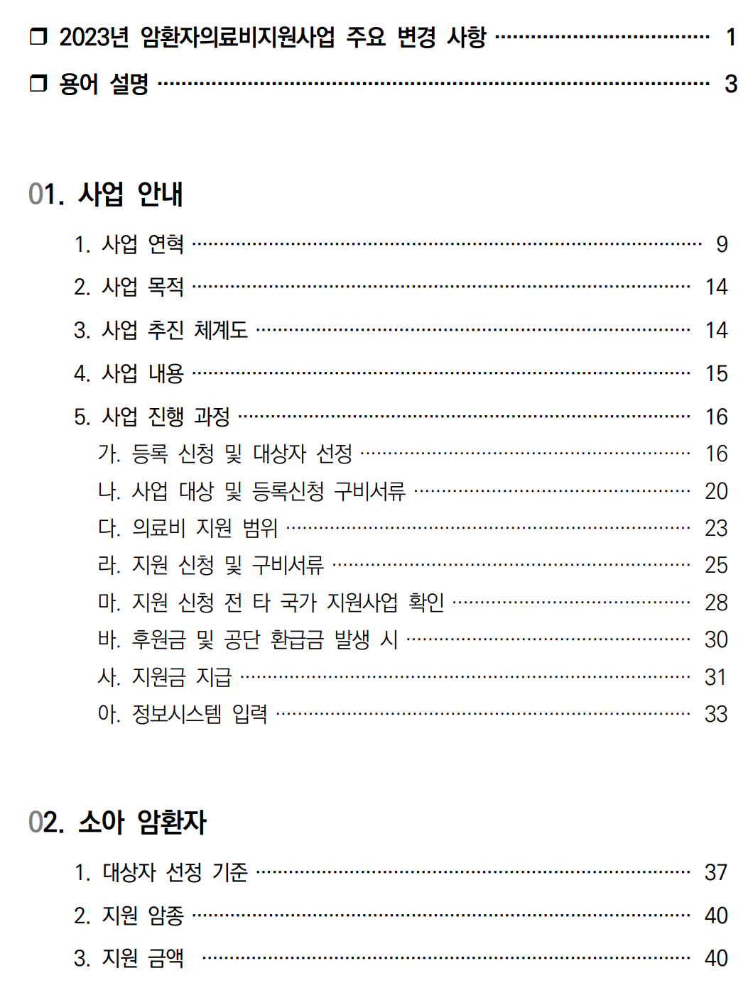 2023년 암환자 의료비지원 사업안내의 목차와 첨부파일이다. 첨부파일은 맨 하단에 있다.