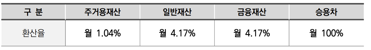 단순히 재산에 대해 환산하는 것이 아니라 기본적인 생활을 위해 재산에 대해 일정부분 제외시켜 주고 계산을 하기 때문에 생각보다 복잡하다.