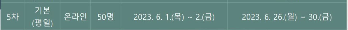 | 15회 | 2023년06월26일(월)~06월30일(금) 총 5일간 | 토요반 6/3 6/10 6/17 6/24 유사교육 총 4일간 |
