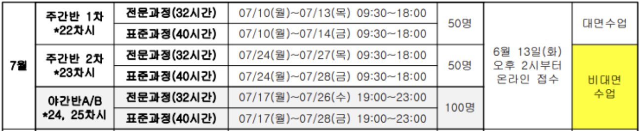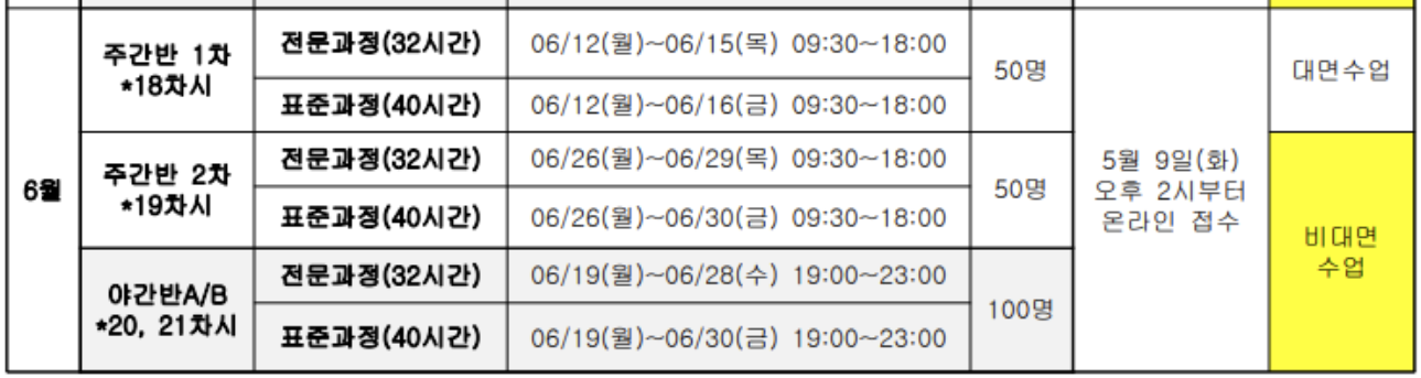 | 2023년 6월( 3차) | 표준과정:6월 26일(월)~30일(금)/전문과정:6월 26일(월),27일(화).28일(수),30일(금) 접수 : 5.21.(일)09:00~ 선착순으로 마감함 |