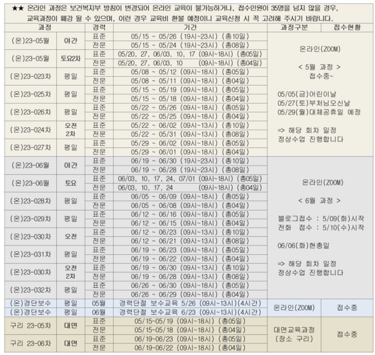 | 활동지원사 양성교육 표준 · 전문 | 2023년 6월 | 회원가입후 접수회원가입후 접수*온라인 줌 교육(교육장소:개인장소) -접수일자: 5/31(수)10:00(선착순 45명/대기 20명(교육취소시 대기자 순) /표준과정(5일):6/12(월)~6/16(금)/전문과정(4일) : 6/12(월)~6/15(목) |