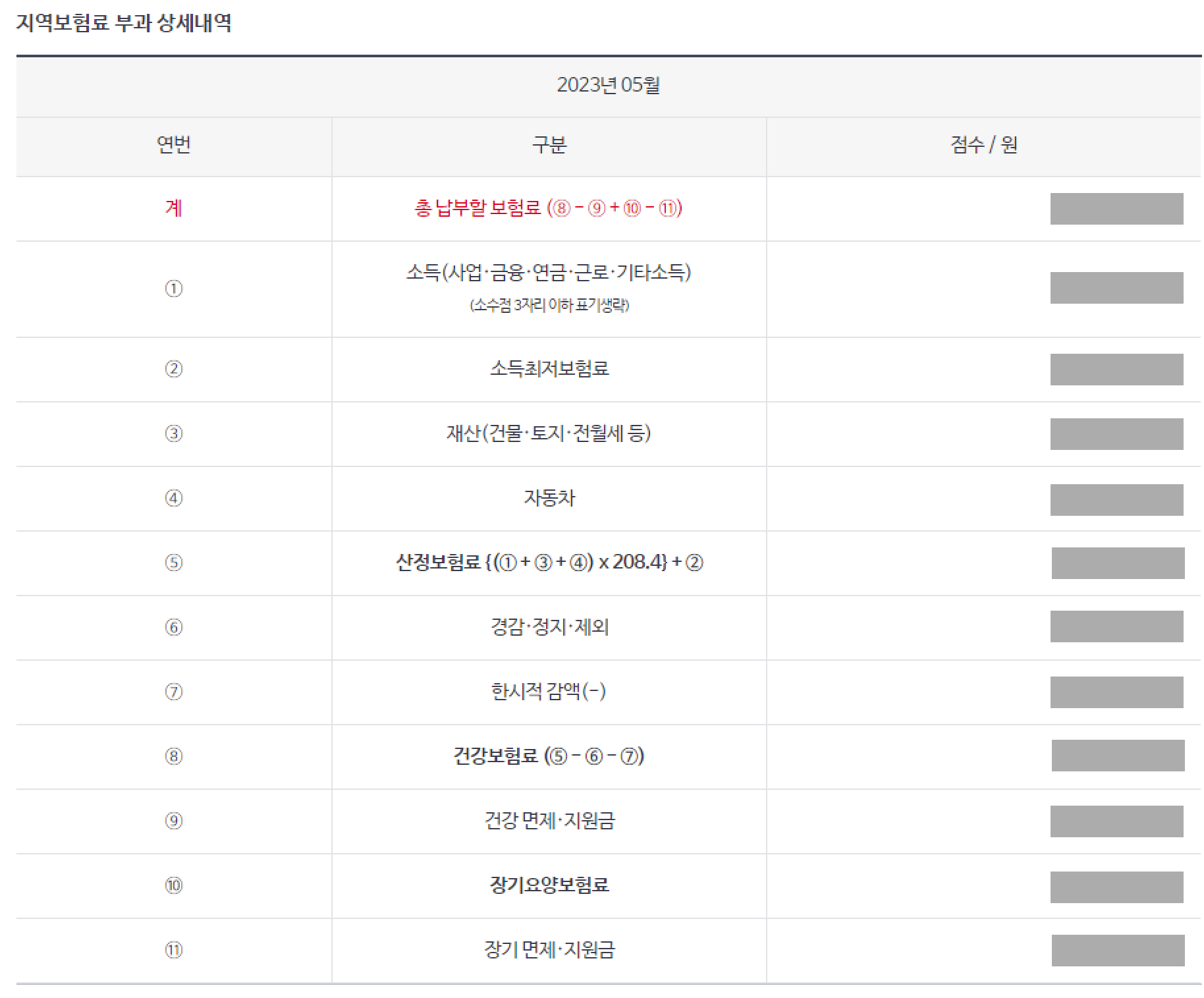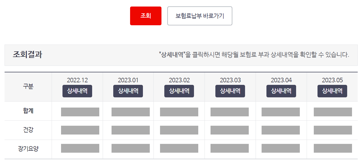 월 단위로 건강보험료(장기요양보험료 제외 금액) 와 장기요양보험, 건강보험+장기요양 합계금액을 표시해 준다.