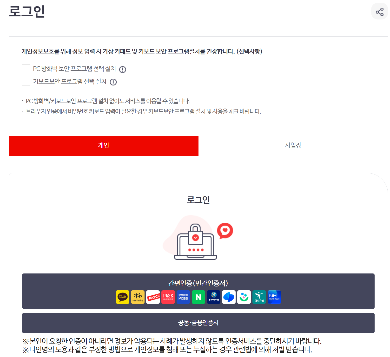 공인인증서 또는 간편인증을 통해 로그인을 할 수 있다.