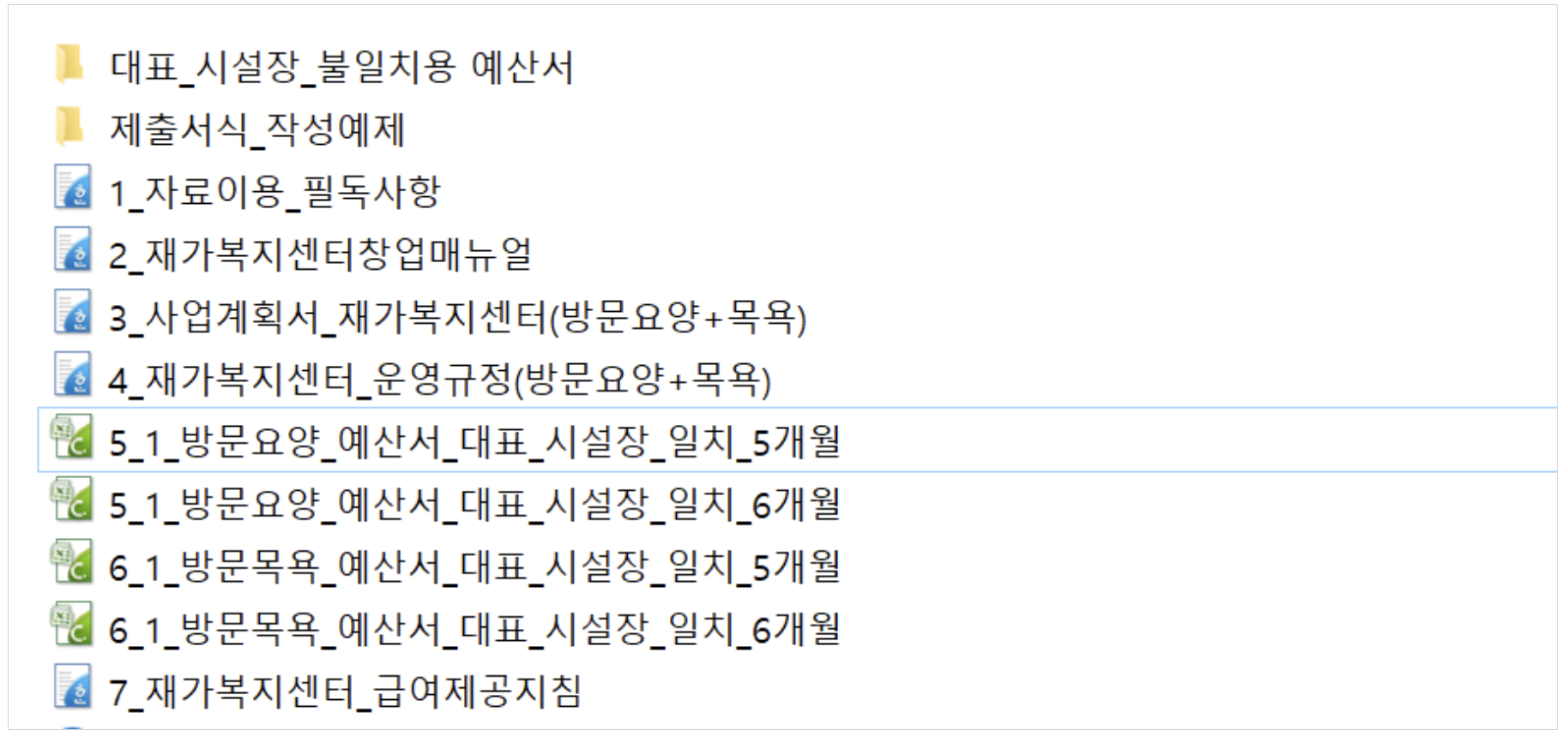 예산서를 포함한 사업계획서, 운영규정 등 재가복지센터 설립 패키지의 다운로드 목록이다.