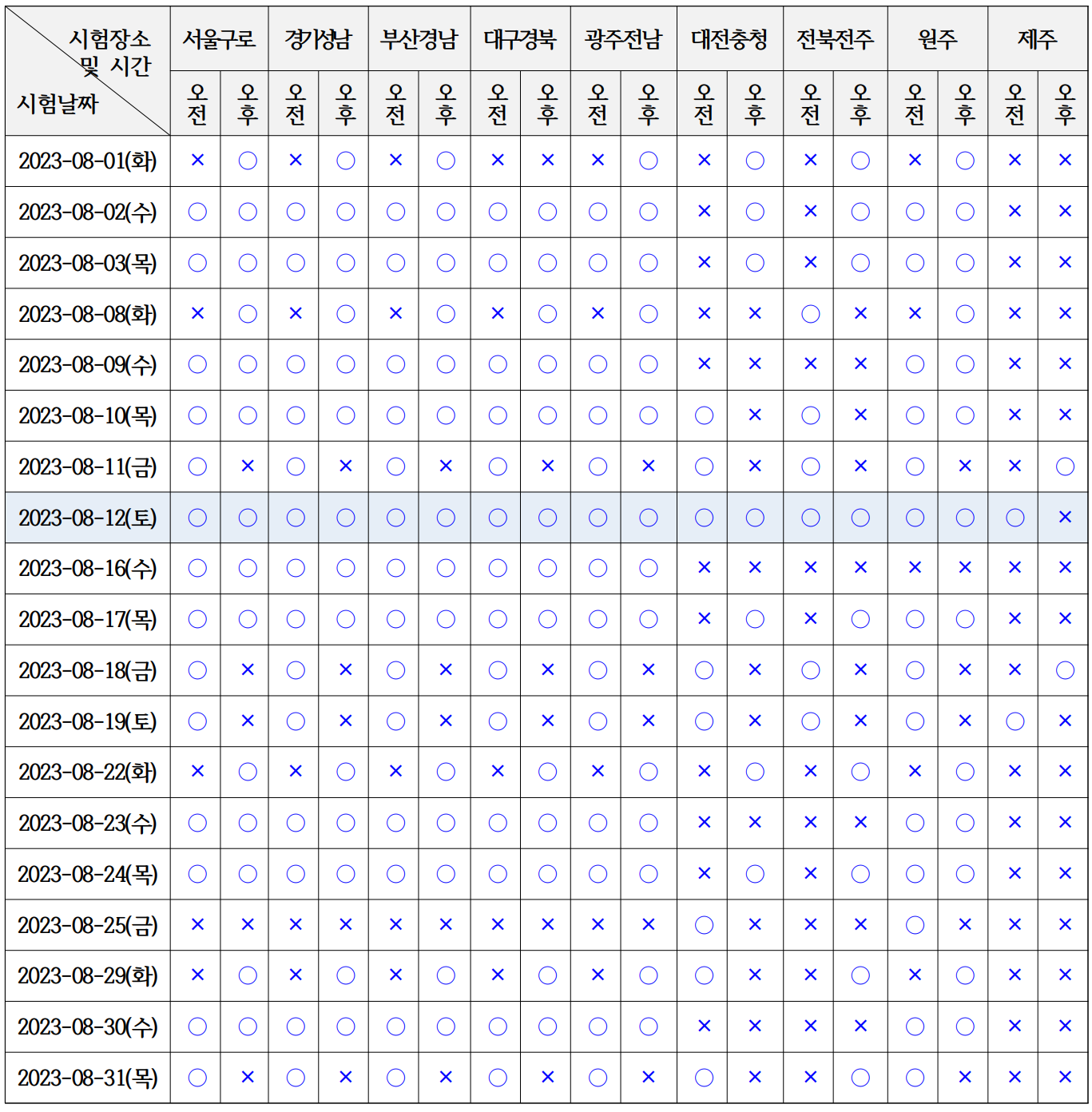 ※ 8.12.(토)만 지필시험을 시행하며, 그 외의 일정은 컴퓨터시험으로 시행. (×:시험없음 ○:시험있음)