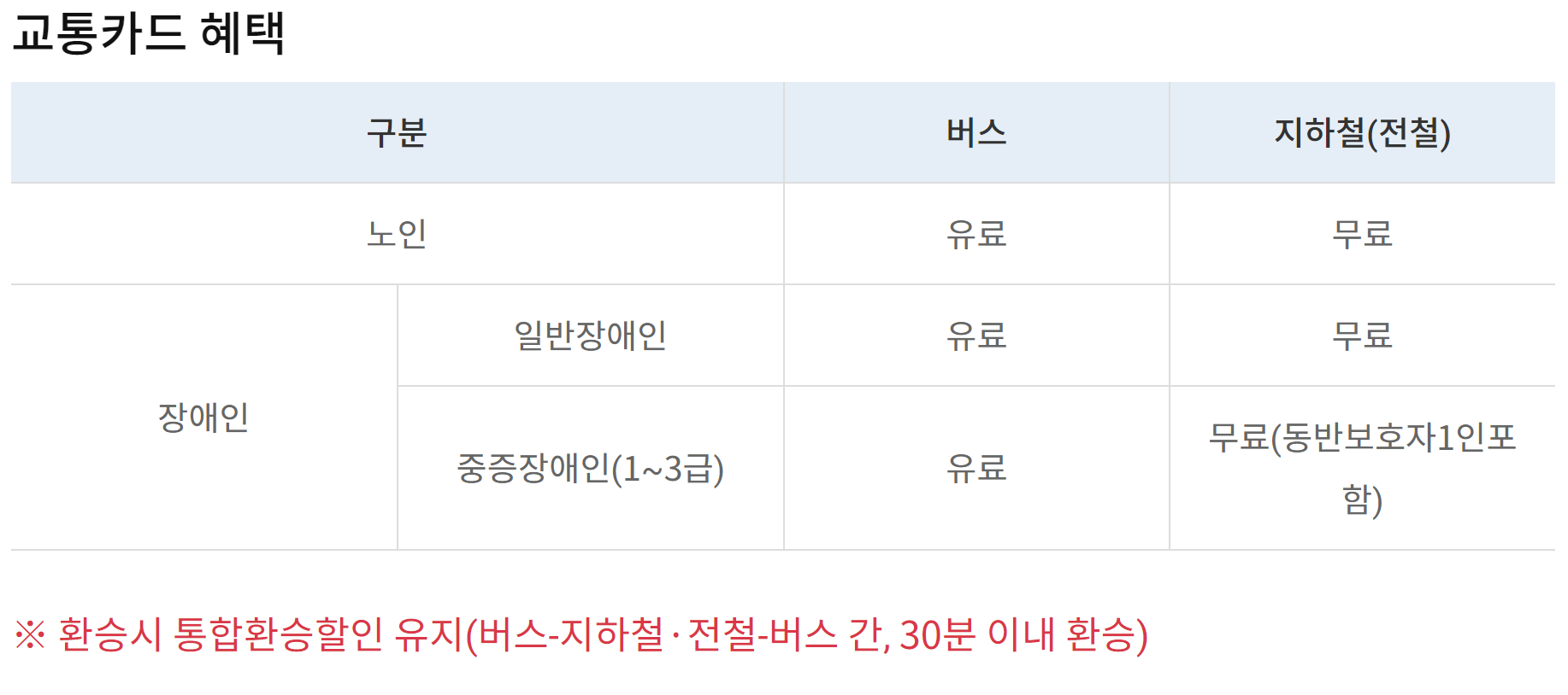 정리를 하지만 65세 이상 노인, 장애인, 국가 유공자 무료 이용 카드를 발급받을 수 있고 수도권 지하철은 무료, 버스는 유료로 이용 가능하다.