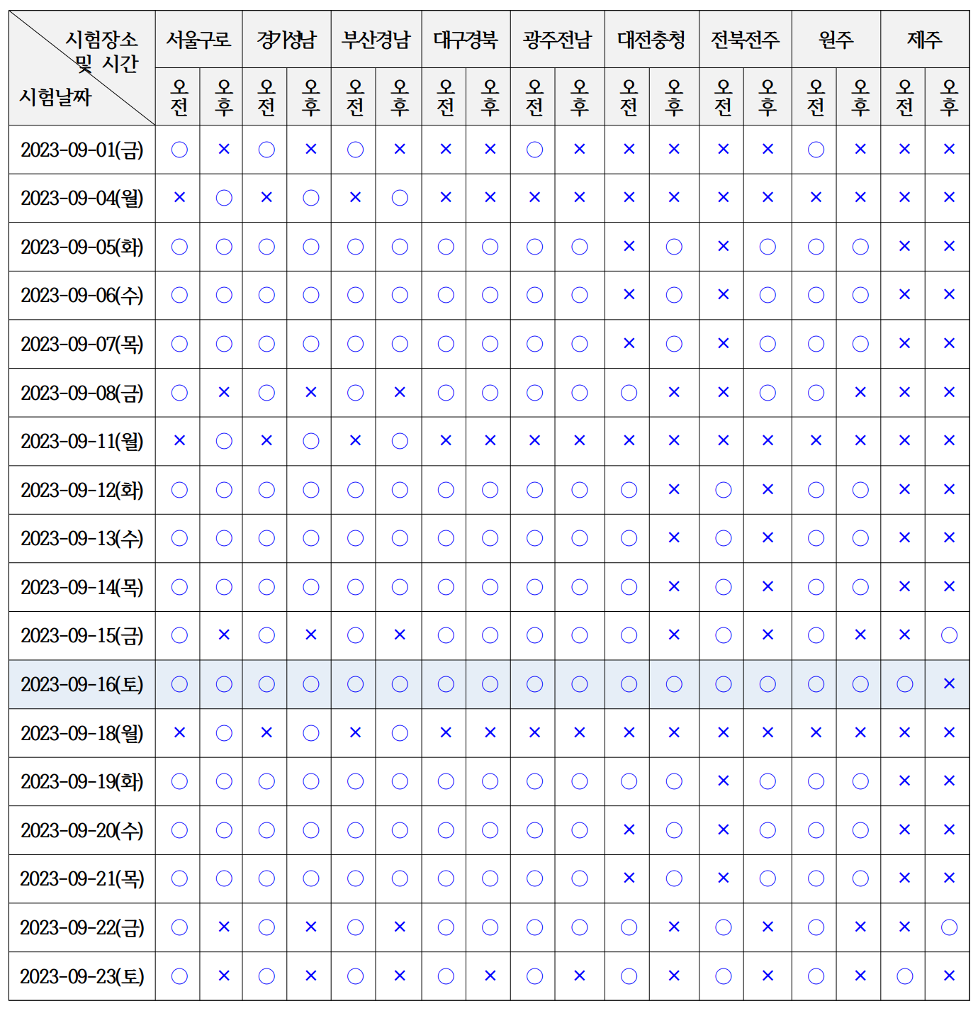 ※ 9.16.(토)만 지필시험을 시행하며, 그 외의 일정은 컴퓨터시험으로 시행. (×:시험없음 ○:시험있음)