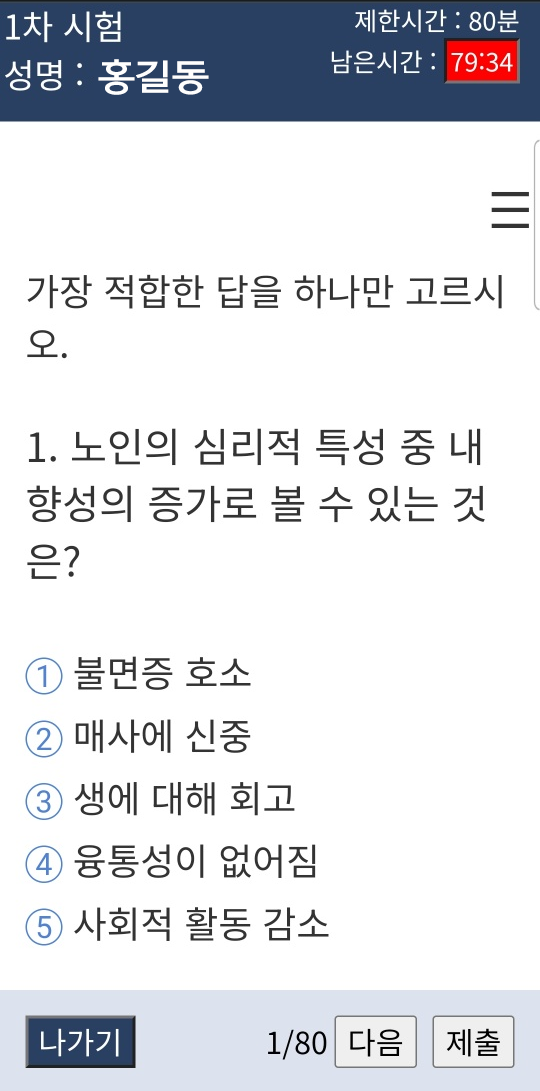 요양보호사 자격 취득 컴퓨터 시험 대비 모의시험 문제풀이 서비스입니다.