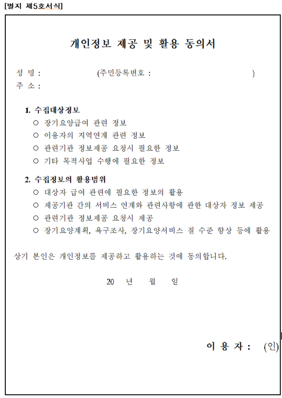 개인정보 제공 및 활용동의서 서식1 ( 장기요양기관용 )