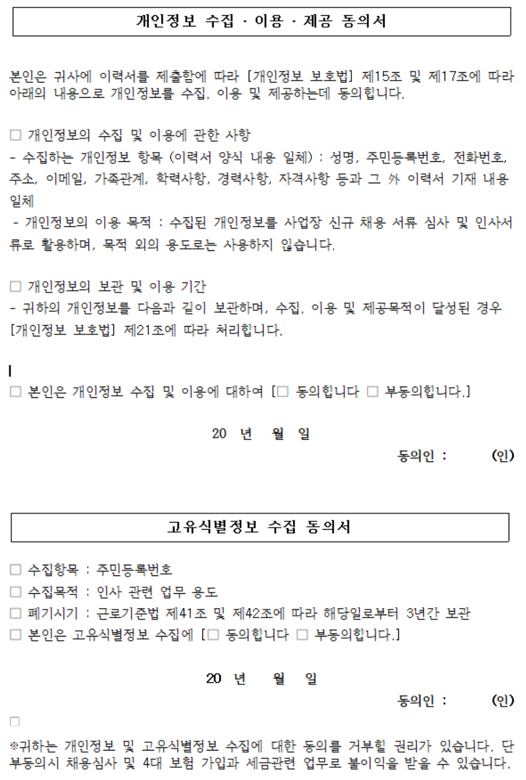 개인정보 제공 및 활용동의서 서식2 ( 고유식별정보 수집 동의서, 인사, 채용 )