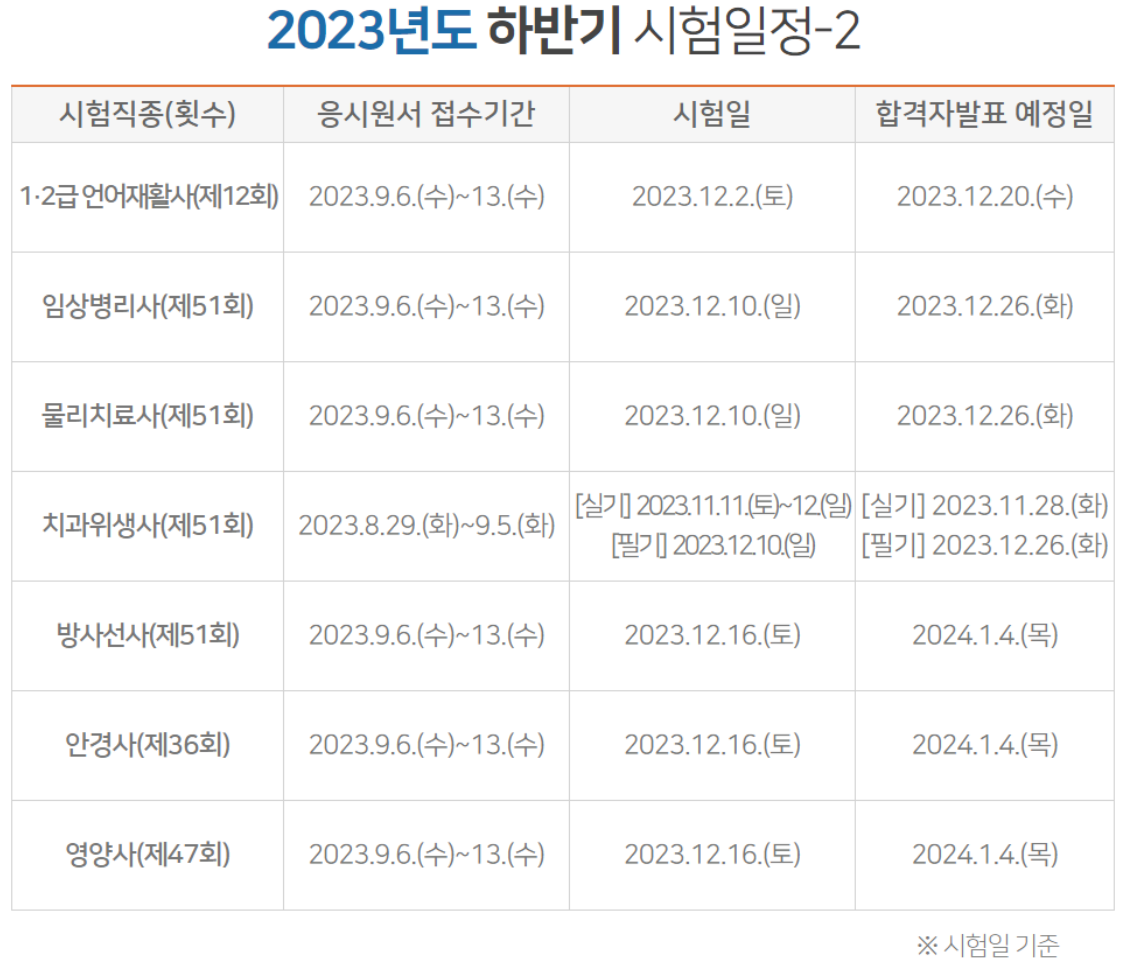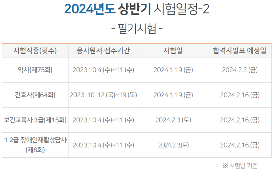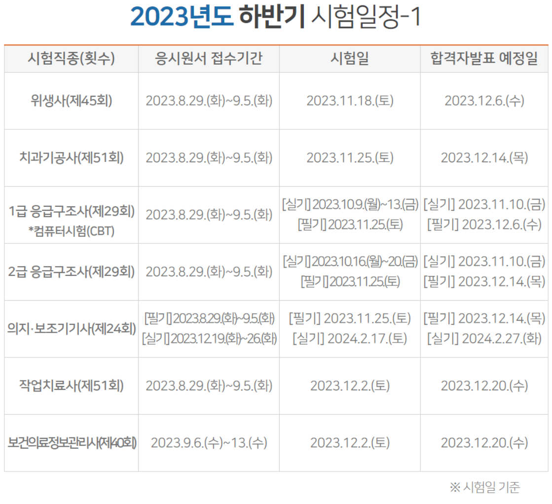 국시원의 2023년 하반기와 2024년 상반기 작업치료사 , 물리치료사, 영양사, 간호사 위생사, 치과기공사, 1급 응급구조사, 2급응급구조사, 의지/보조기사, 보건의료정보관리사 등 보건의료인 국가시험 일정이다.