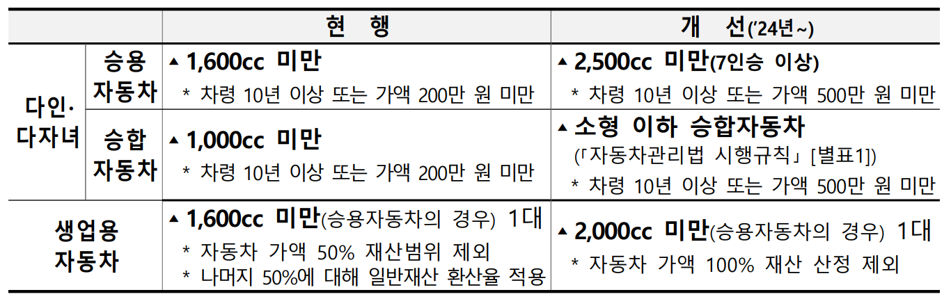 다인가구, 다자녀가구에 대한 자동차 기준이 완화되었고, 생업용 자동차에 대한 기준도 완화되었다.