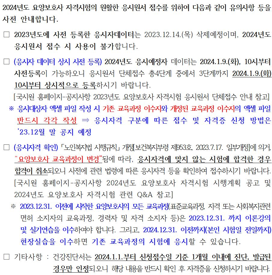 1. 2023년도에 사전 등록한 응시자데이터는 2023. 12. 14.(목) 삭제예정이며, 2024년도 응시원서 접수 시 사용이 불가