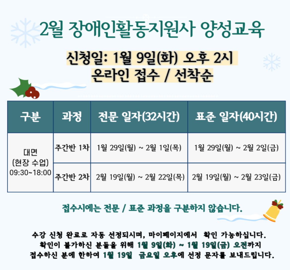 | 2024년 1월 전국 장애인활동지원사 양성 교육 일정 모음 (0) | 2024.01.02 |
