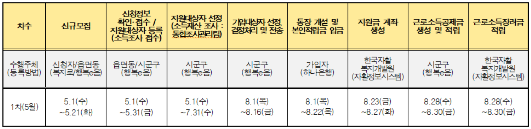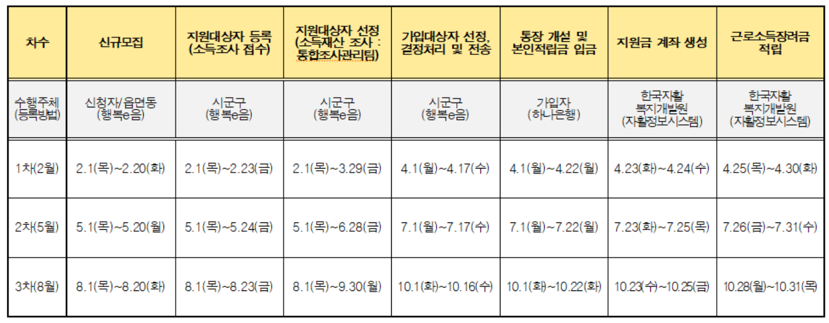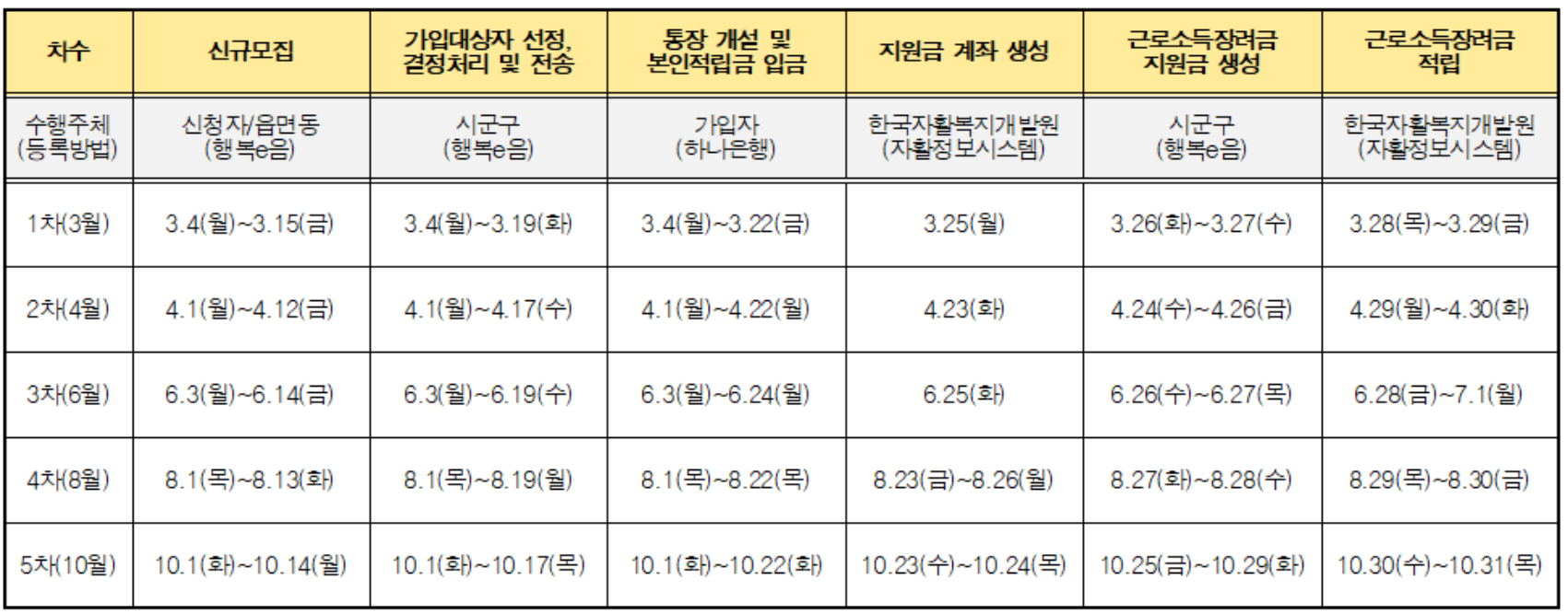 자산형성지원사업인 청년내일저축계좌와 희망저축계좌에 대한 2024년도 신규 모집 일정이다.