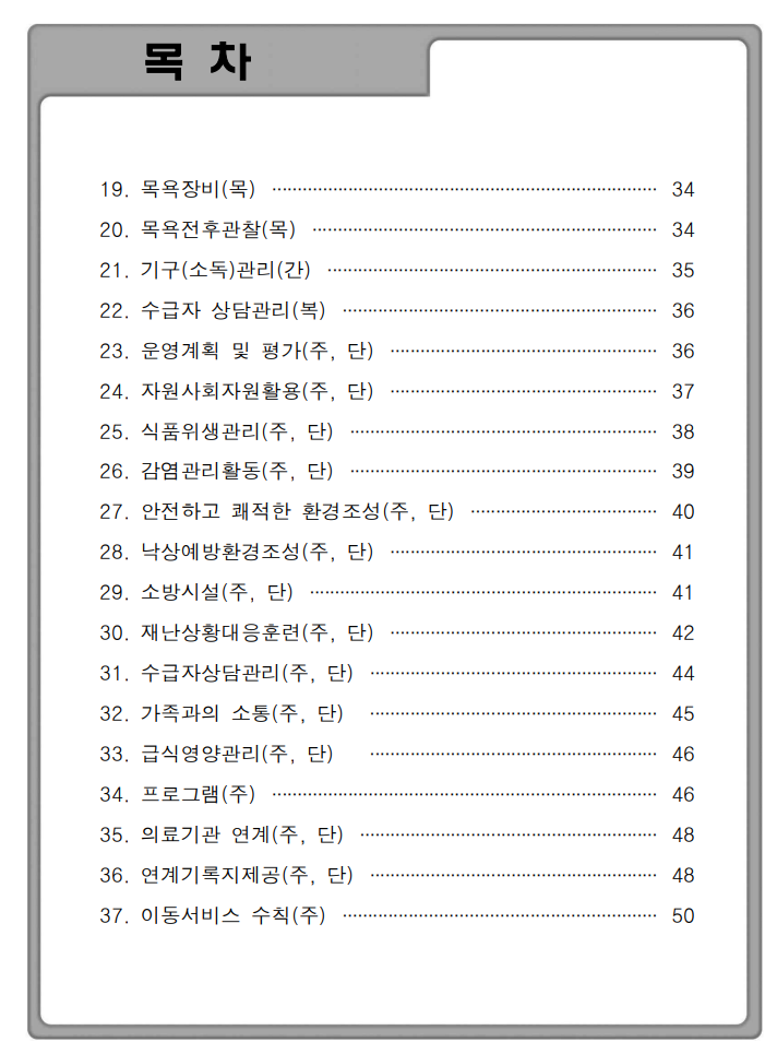수급자의 권리보장, 급여제공 결과평가, 환경 조성, 재난 대응까지 폭넓은 내용을 다루며, 장기요양기관의 운영에 필요한 실용적인 정보를 제공하고 있다.
