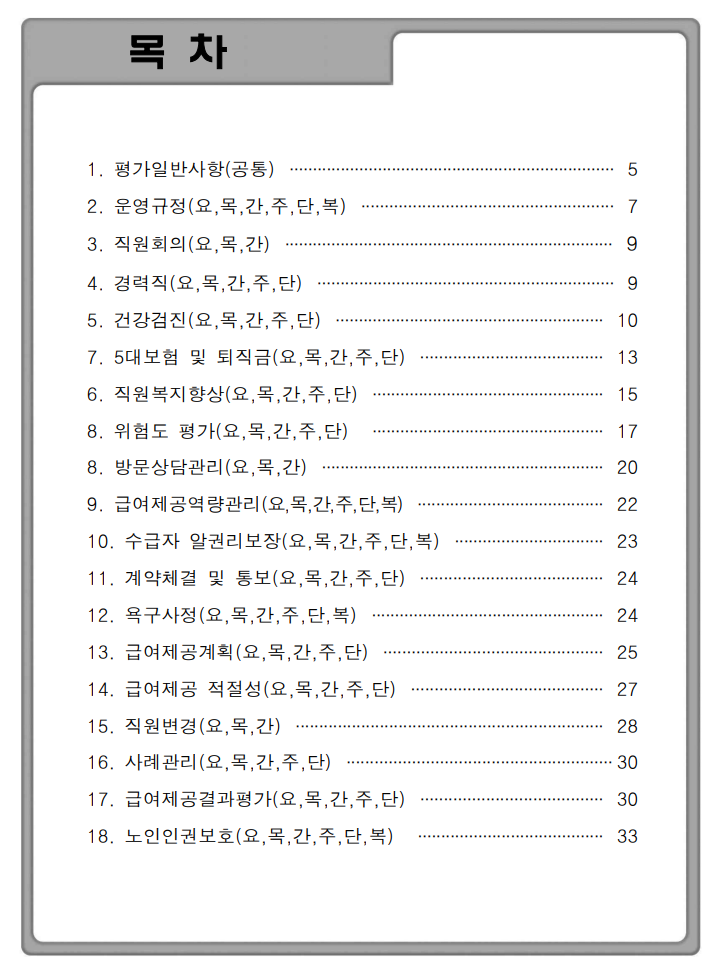 이 자료는 평가에 필요한 일반적인 사항부터 운영규정, 직원회의, 건강검진, 급여제공 등에 이르기까지 다양한 주제를 다루고 있다.
