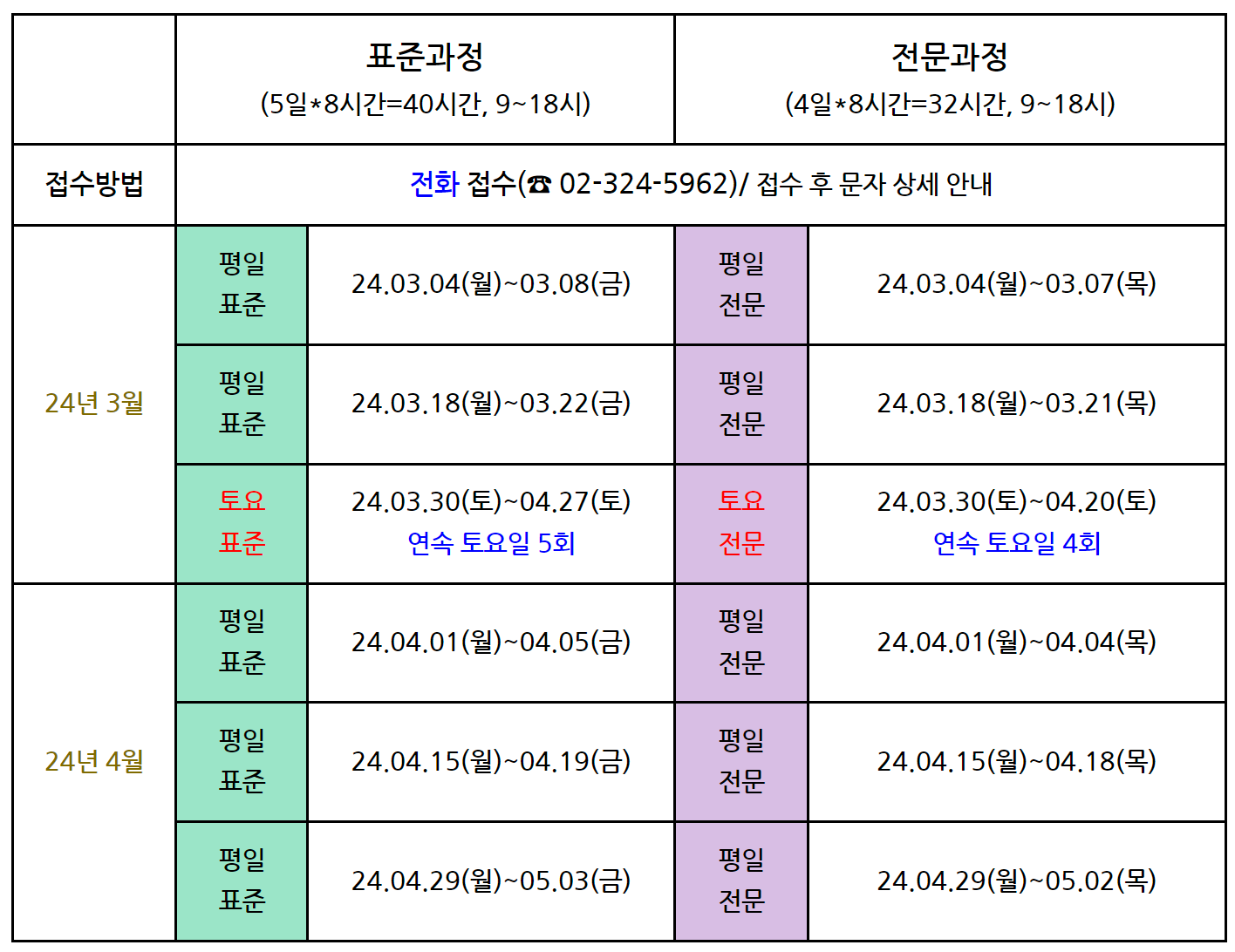 | 신규 평일반 | 05차 | 40 | 2024년 03월 25(월)~ 03월 29(금) (5일간 오전 9시 ~ 오후 6시) |