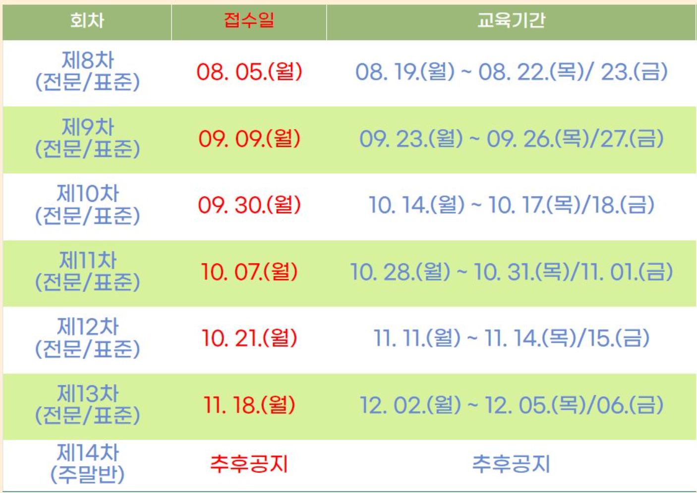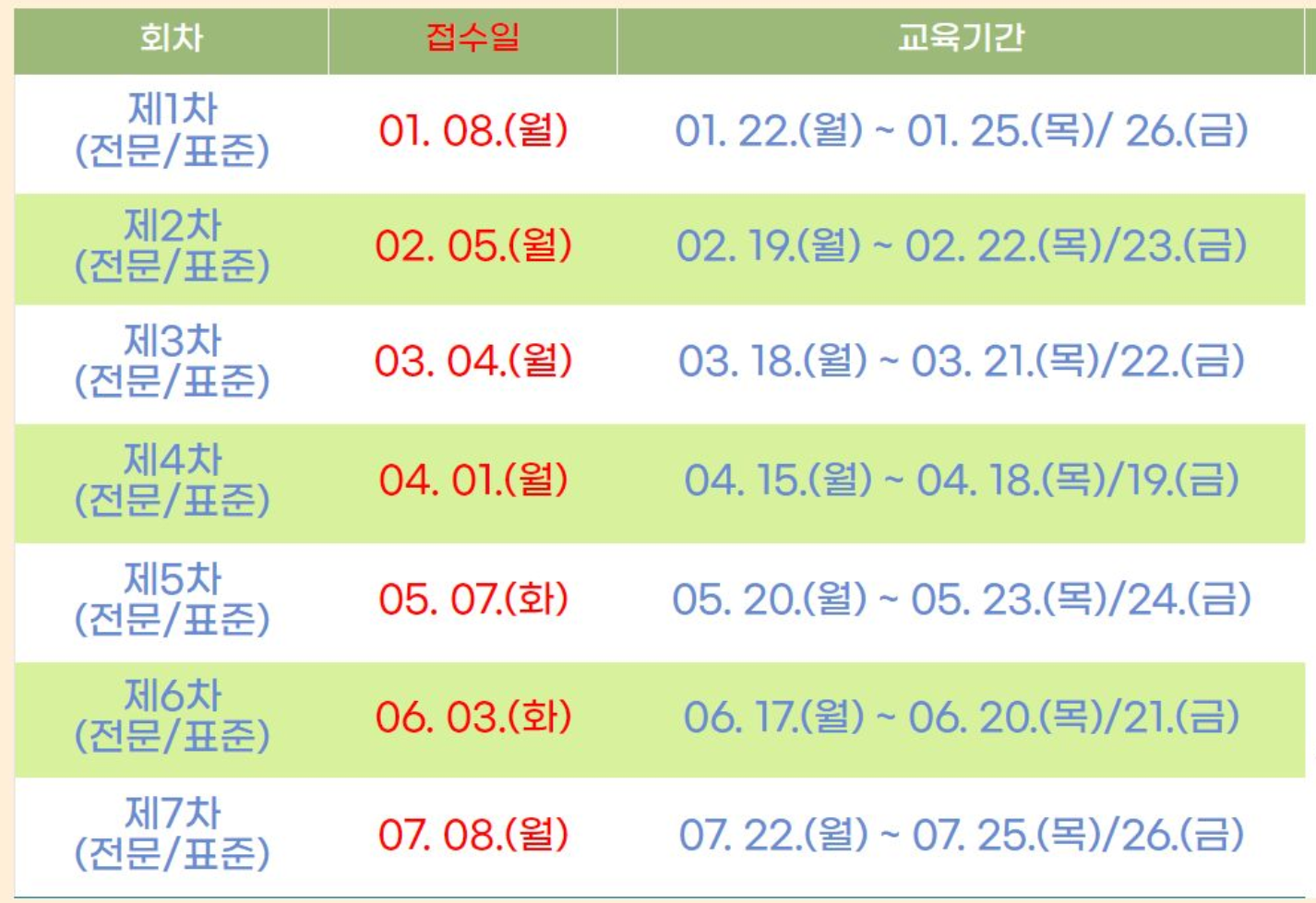 교육일정은 기관 사정에 따라 변경될 수 있으니 홈페이지의 연간 일정을 수시로 확인해 봐야 한다.