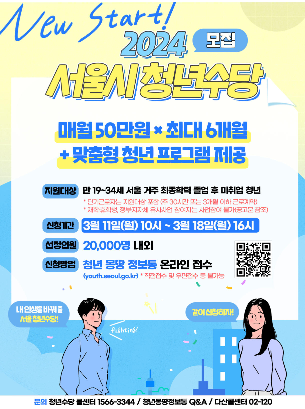 자세한 사항은 서울시 청년수당 콜센터(☎ 1566-3344)나 다산콜센터(☎ 120)로 문의할 수 있다.