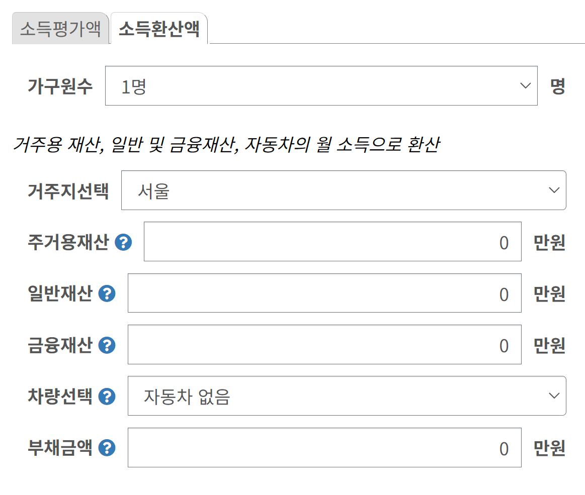 모의계산기는 소득평가액과 소득환산액을 구분해서 계산해 볼 수 있다.