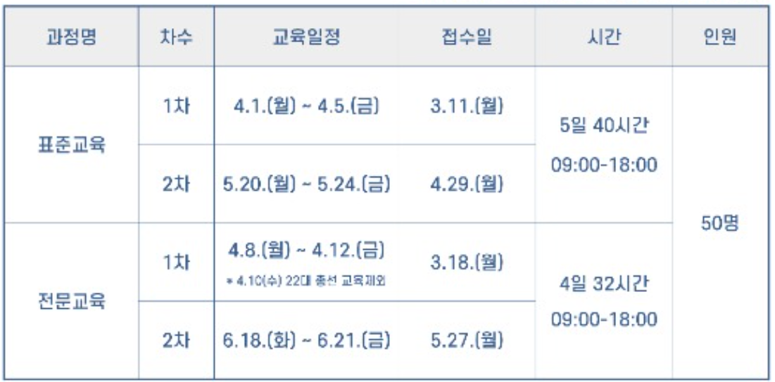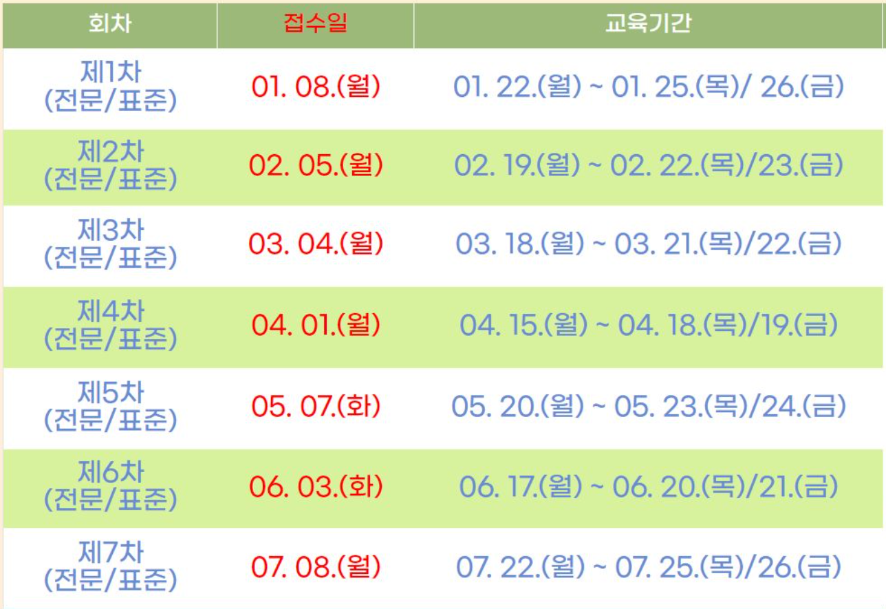| 9회 | 2024년04월15일(월)~04월19일(금) 총 5일간 | 토요반 4/20 4/27 5/4 5/11 유사교육 총 4일간 |