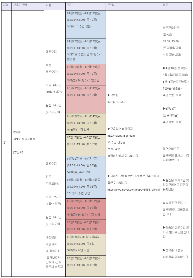 경기도에 위치한 활동지원사 교육기관의 2024년 4월 교육 일정 모음이다. 교육 일정은 해당 기관 사정에 따라 변경 될 수 있다.