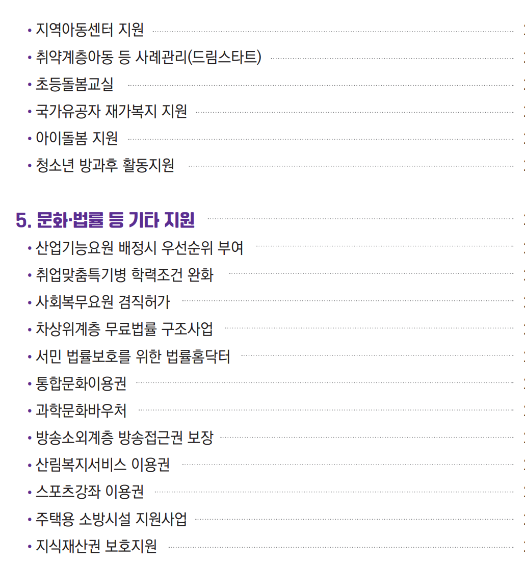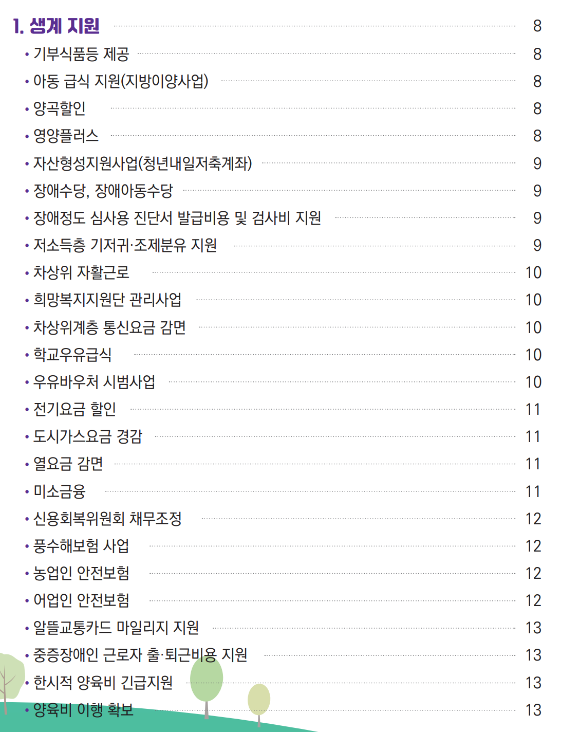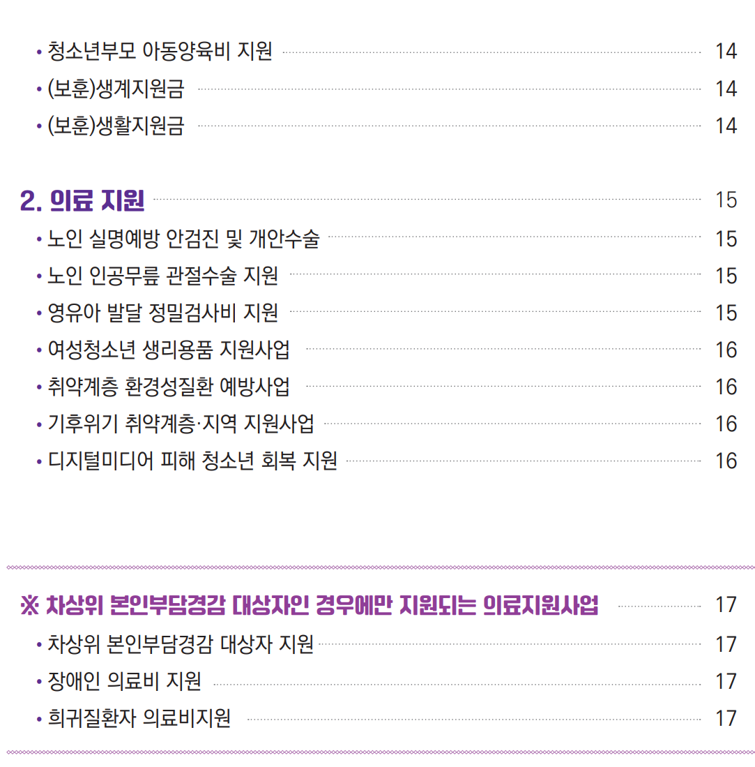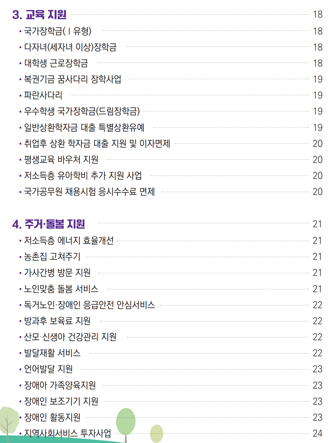 아래는 차상위계층이 제공 받을 수 있는 복지 정책을 소개한 2024년 중앙부처 차상위계층 지원사업 안내에 대한 목차입니다.