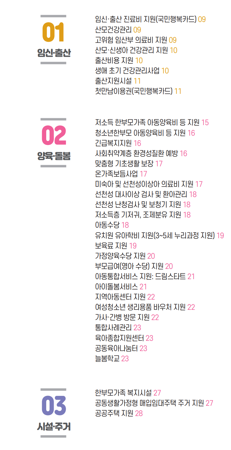 이는 임신·출산 진료비, 아동양육비, 주거 지원, 교육비 지원, 양육비 이행지원 서비스 등 한부모가족이 필요로 하는 다양한 지원을 상세히 안내를 포함한다.